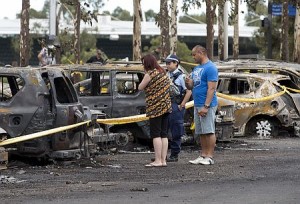 現場は、シドニー国際水泳センターの駐車場。車の燃料タンクが爆発し、タイヤが破裂する中、数百人が逃げ出す騒ぎになったが、けが人は出なかった。